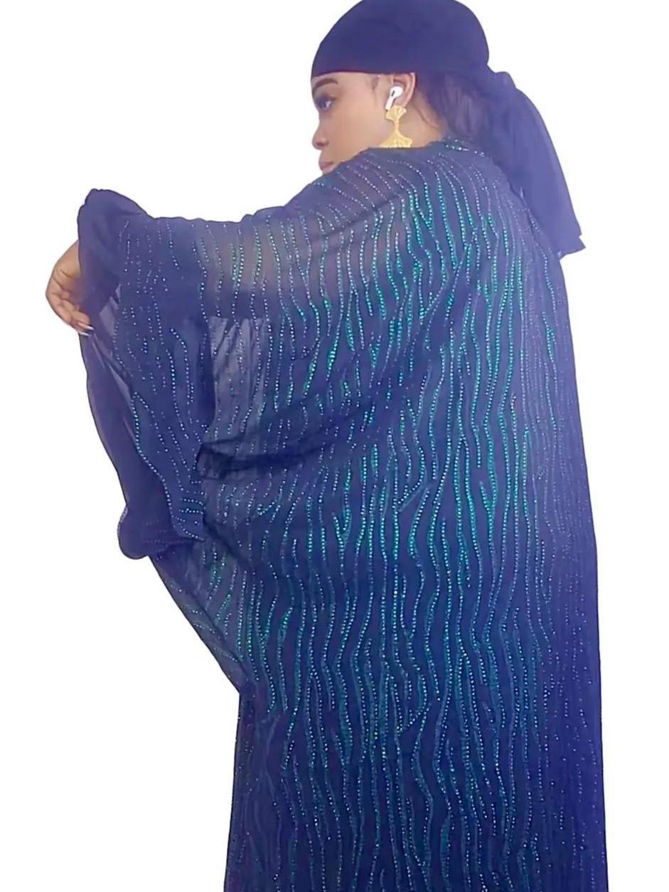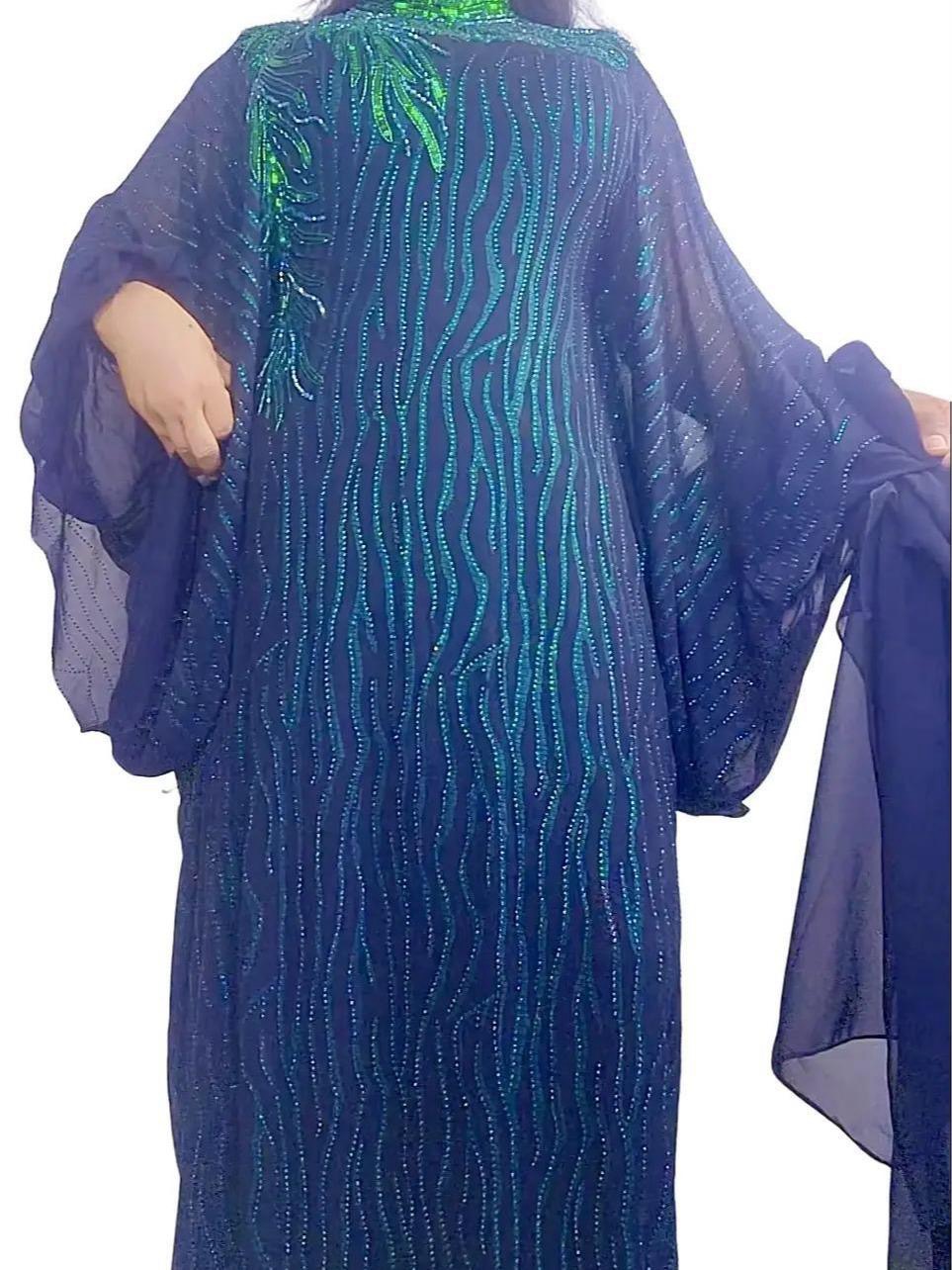 ✨ Elegant Blue Abaya Set: This set includes a 3-piece abaya, an inner scarf, and a handmade stone abaya jacket. The inner belt complements the outfit, enhancing its elegance.
